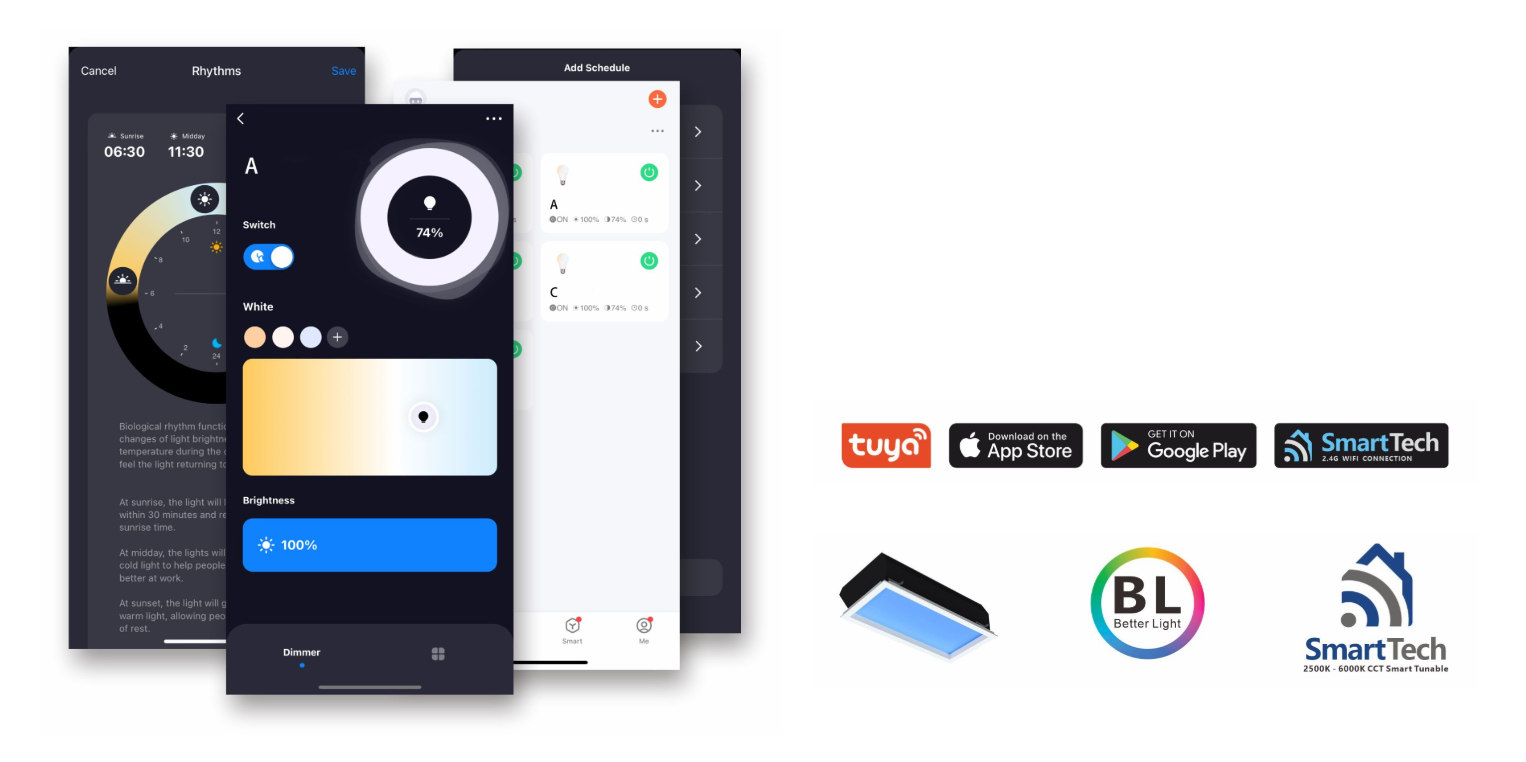 Adjustable light temperature (CCT 1800K–20000K) simulates different times of day, improving focus and relaxation. Perfect for offices and workspaces, it adapts to the circadian rhythm, boosting energy and work efficiency.